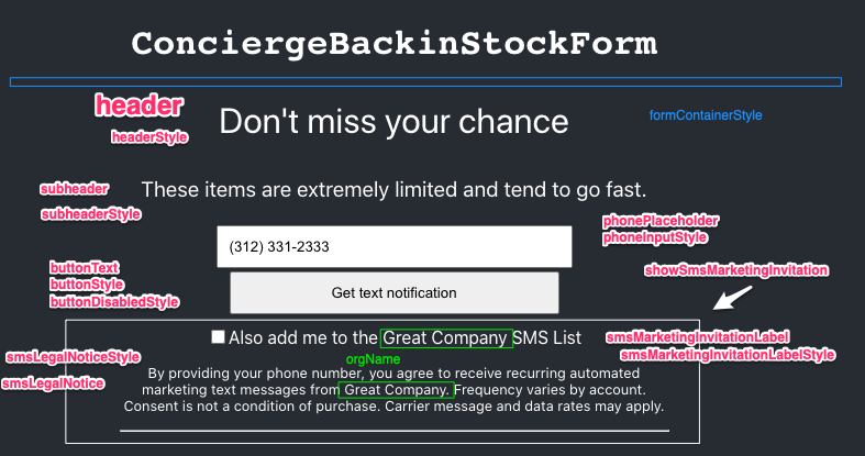 configurationorgName: *required*, header: "Don't miss your chance", successText: "Thank you. We'll send you a message when this item is back in stock.", subheader: "These items are extremely limited and tend to go fast.", phonePlaceholder: 'Enter your phone number', buttonText: 'Get text notification', formContainerStyle: {textAlign: 'center', fontFamily: 'Helvetica'}, buttonStyle: {padding: '10px', width: '60%'}, buttonDisabledStyle: {opacity: 0.7, padding: '10px', width: '60%', cursor: 'not-allowed'}, headerStyle: {fontSize: "2rem"}, subheaderStyle: {fontSize: "1.2rem"}, phoneInputStyle: {padding: '10px', width: '60%'}, showSmsMarketingInvitation: true, smsMarketingInvitationLabel: 'Also add me to the {{org_name}} SMS List', smsLegalNoticeStyle: {fontSize: "0.8rem"}, smsLegalNotice: "By providing your phone number, you agree to receive recurring automated marketing text messages from {{org_name}}. Frequency varies by account. Consent is not a condition of purchase. Carrier message and data rates may apply.", onSuccess: () => {}, onError: (error) => {console.error(error)},