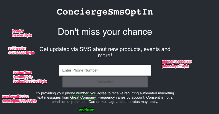 configurationorgName: *required*, header: "Don't miss your chance", subheader: "Get updated via SMS about new products, events and more!", phonePlaceholder: 'Phone number', buttonText: 'Subscribe', successText: 'Thank you. We have sent you a message to confirm your subscription.', formContainerStyle: {textAlign: 'center', fontFamily: 'Helvetica'}, buttonStyle: {padding: '10px', width: '60%'}, buttonDisabledStyle: {opacity: 0.7, padding: '10px', width: '60%', cursor: 'not-allowed'}, headerStyle: {fontSize: "2rem"}, subheaderStyle: {fontSize: "1.2rem"}, phoneInputStyle: {padding: '10px', width: '60%'}, smsLegalNoticeStyle: {fontSize: "0.8rem"}, smsLegalNotice: "By providing your phone number, you agree to receive recurring automated marketing text messages from {{org_name}}. Frequency varies by account. Consent is not a condition of purchase. Carrier message and data rates may apply.", onSuccess: () => {}, onError: (error) => {console.error(error)},